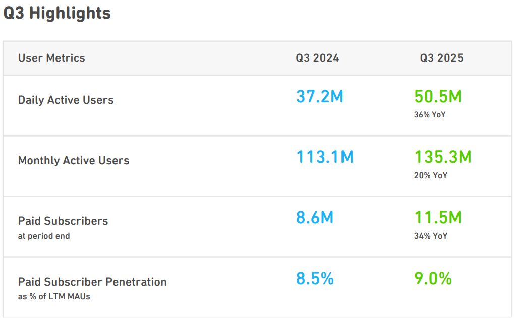 This creates a funnel where subscription penetration remains low relative to other consumer subscription businesses, but unit economics are extremely profitable for those who pay. Paid user growth remains strong, with both DAUs and revenue increasing more than 40% year-over-year while profitability continues to expand.